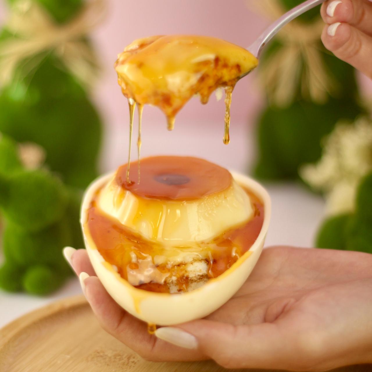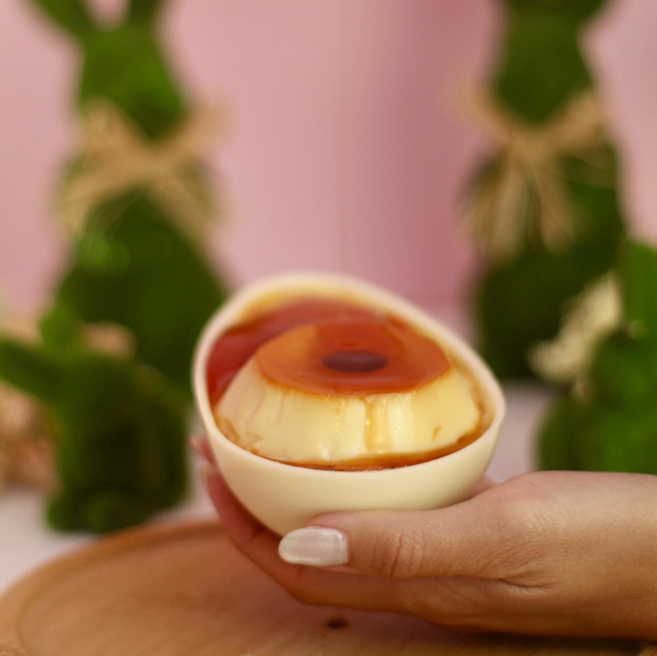 Um ovo com casca de chocolate branco, recheado com brigadeiro de ninho, massa de bolo e creme de ninho e pra complementar, ele vai com um PUDIM por cima! Aprox 380g